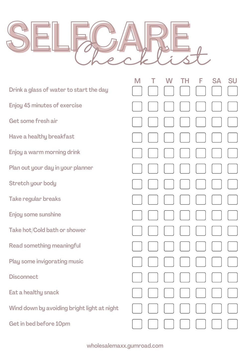 Revitalize your self-care routine with our one-page Self-Care Checklist printable. This concise guide provides a comprehensive list of nurturing activities, empowering you to create a personalized self-care plan. Easy to print and use, this checklist is a simple yet effective tool to cultivate a healthier and happier lifestyle. Elevate your well-being by incorporating these mindful practices into your daily routine effortlessly with our Self-Care Checklist printable.